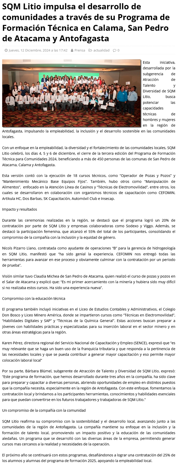Programa de Formación Técnica de SQM beneficia a 450 personas - (El Mercurio de Calama)
