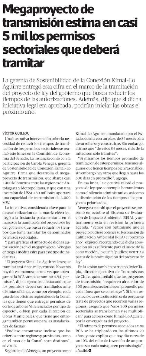 Kimal-Lo Aguirre: más de la mitad de los plazos del proyecto será para obtener casi cinco mil permisos sectoriales - (El Mercurio de Santiago)