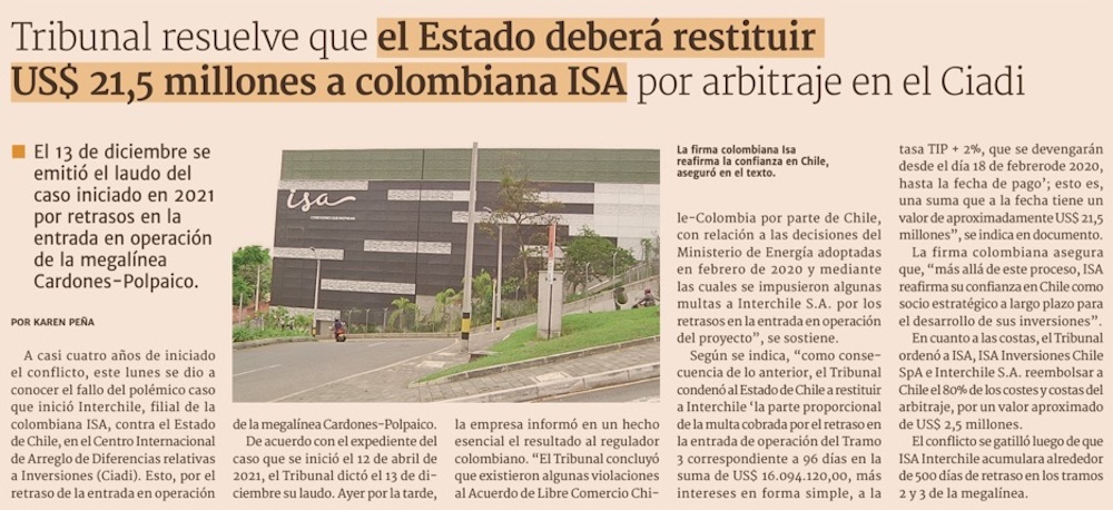 Ciadi condena a Chile a pagar sólo US$20 millones a ISA por megalínea Cardones-Polpaico - (Pulso)