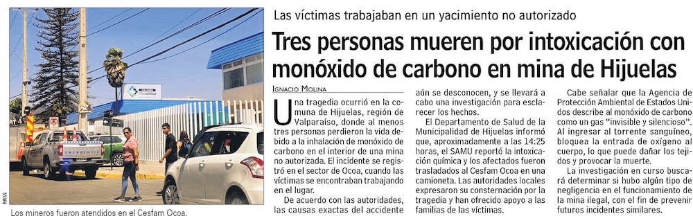 Inician investigación de mina ilegal en Hijuelas que dejó tres fallecidos tras una emergencia química - (El Mercurio de Santiago)