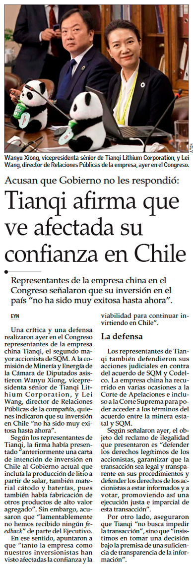 Tianqi asegura que la inversión en SQM “no ha sido muy exitosa” y que se “ha visto afectada la confianza en Chile” - (Diario Financiero)