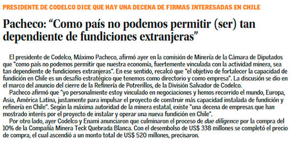 Pacheco: Codelco ha conversado con 10 firmas para ampliar capacidad de fundición en Chile - (Pulso)
