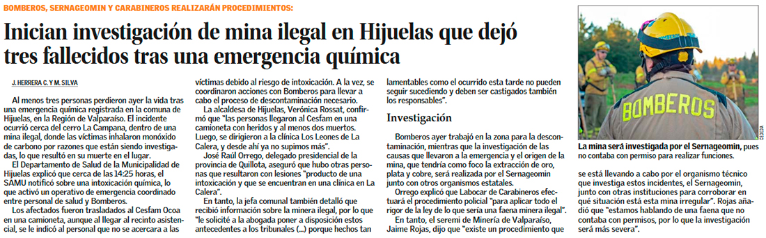 Tres personas mueren por intoxicación con monóxido de carbono en mina de Hijuelas - (Las Últimas Noticias)