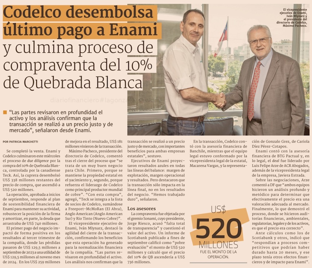 Culmina el proceso de compraventa del 10% de la minera Teck Quebrada Blanca - (El Mercurio de Antofagasta)