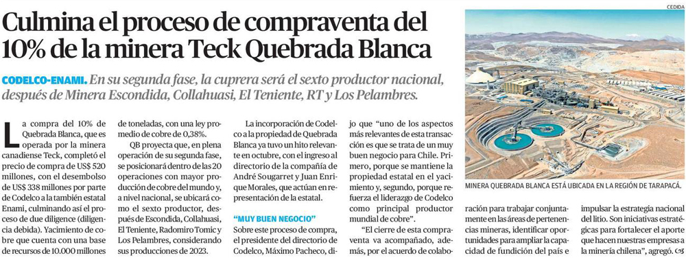 Codelco desembolsa último pago a Enami y culmina proceso de compraventa del 10% de Quebrada Blanca - (Diario Financiero)