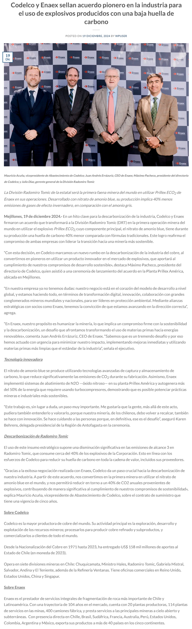 Codelco utilizará explosivos pioneros: Tienen menor huella de carbono - (cooperativa online)