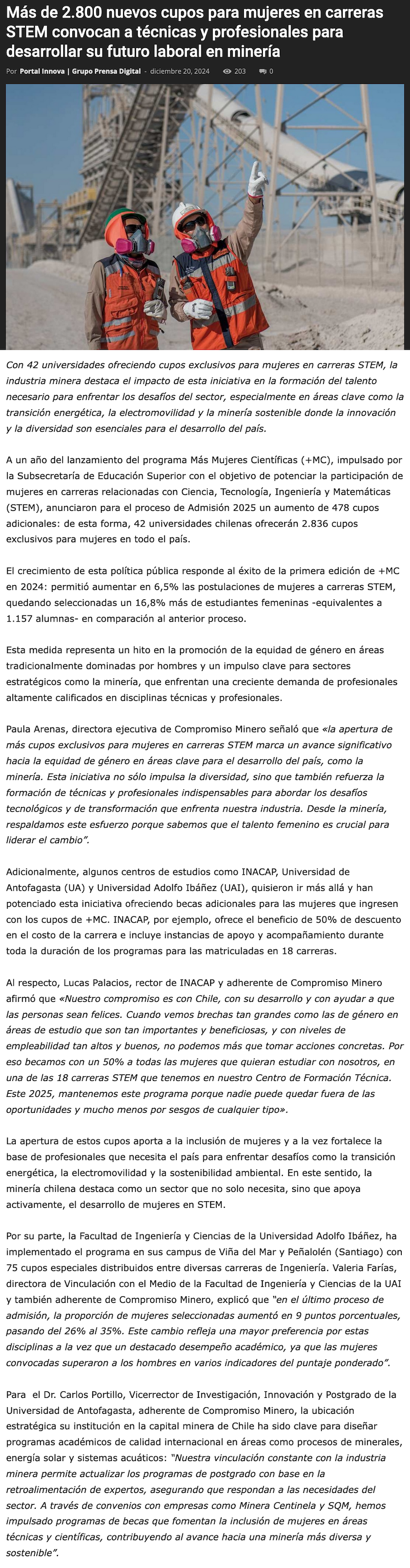 Más de 2.800 nuevos cupos para mujeres en carreras STEM convocan a técnicas y profesionales para desarrollar su futuro laboral en minería - (innovacionyemprendimiento.cl)