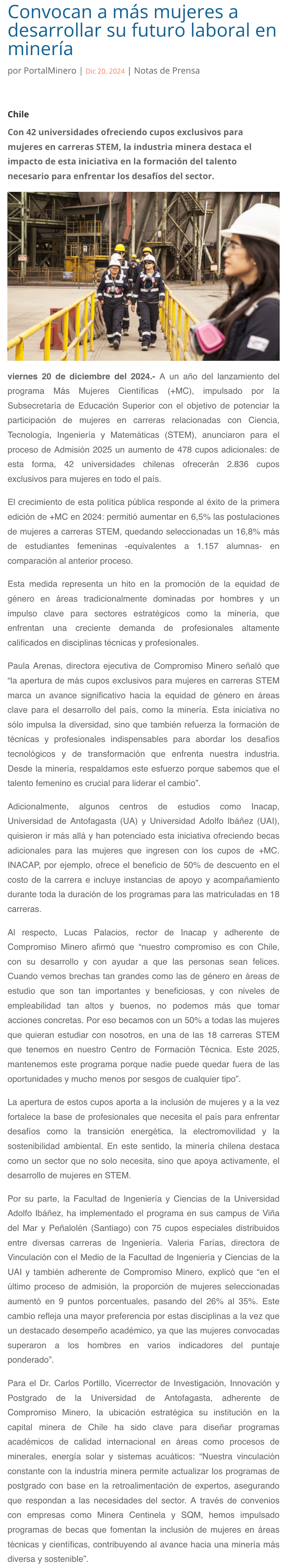 Más de 2.800 nuevos cupos para mujeres en carreras STEM convocan a técnicas y profesionales para desarrollar su futuro laboral en minería - (portalinnova.cl)