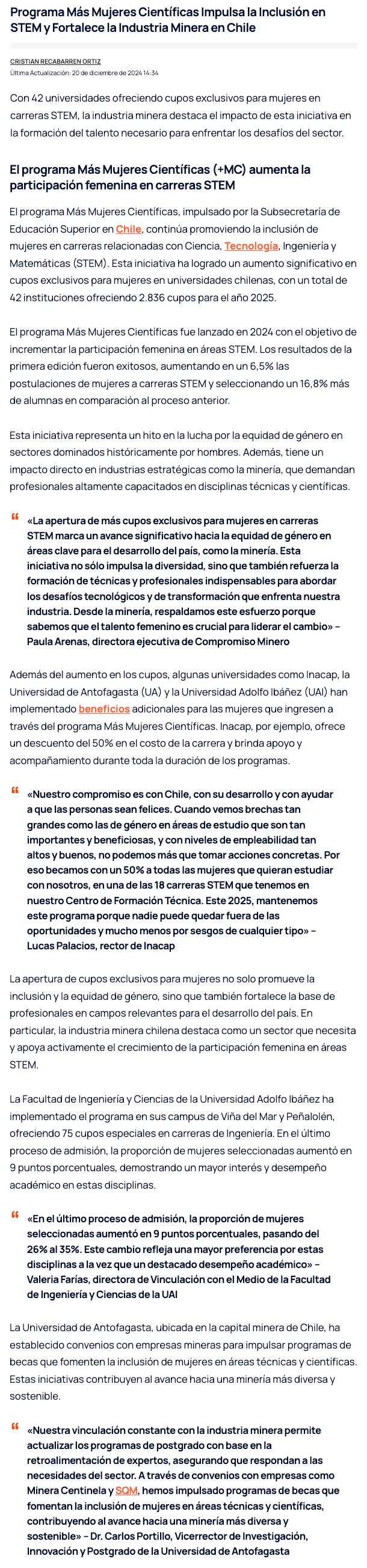 Más de 2.800 nuevos cupos para mujeres en carreras STEM convocan a técnicas y profesionales para desarrollar su futuro laboral en minería - (innovacionyemprendimiento.cl)