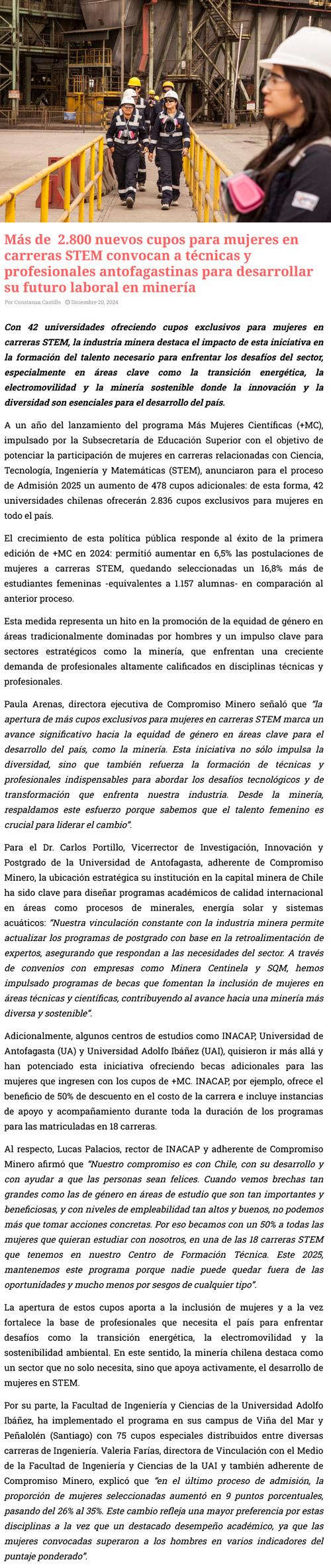 Más de 2.800 nuevos cupos para mujeres en carreras STEM convocan a técnicas y profesionales para desarrollar su futuro laboral en minería - (portalinnova.cl)