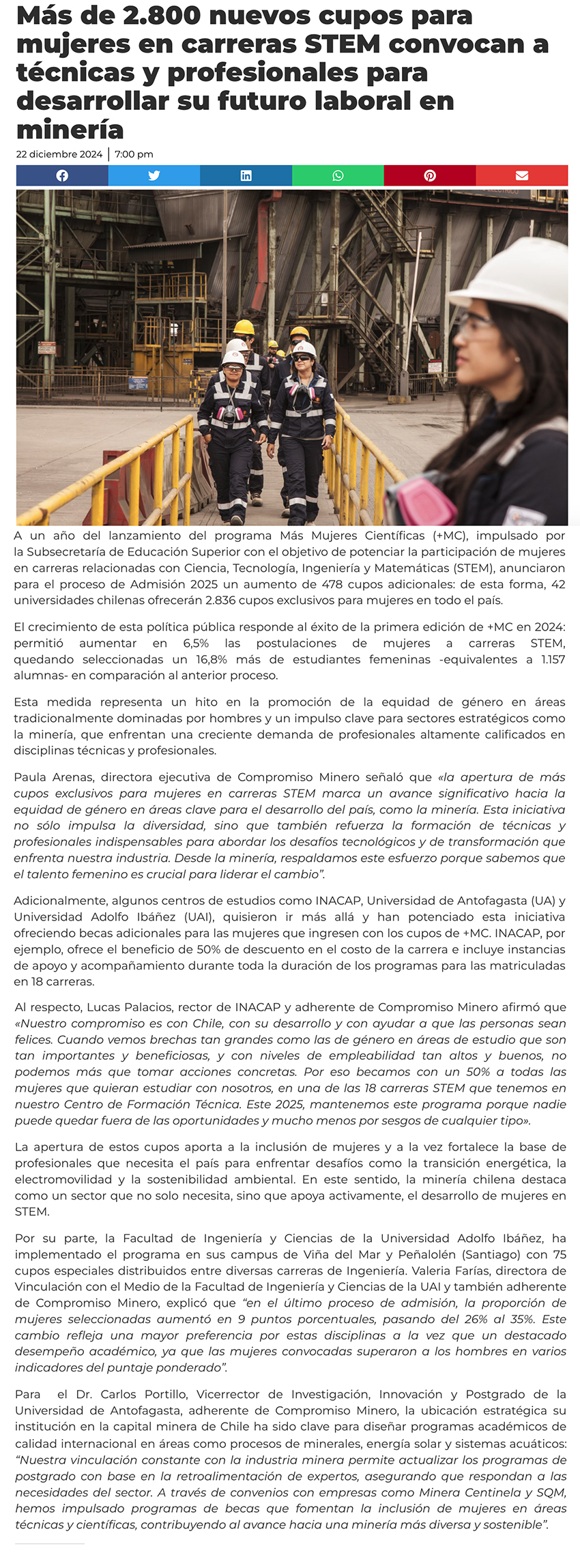 Más de 2.800 nuevos cupos para mujeres en carreras STEM convocan a técnicas y profesionales para desarrollar su futuro laboral en minería - (portalinnova.cl)