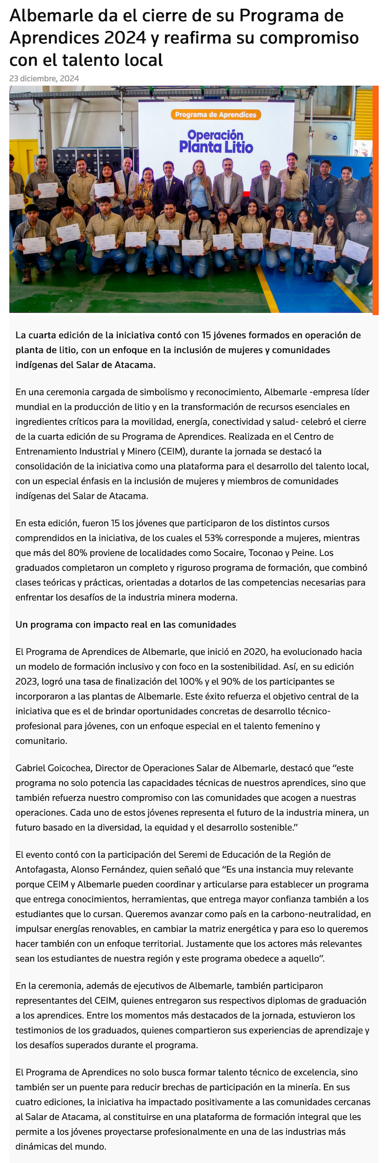 Albemarle finaliza en CEIM Programa de Aprendices 2024 reafirmando su compromiso con el territorio - (calamaenlinea.cl)