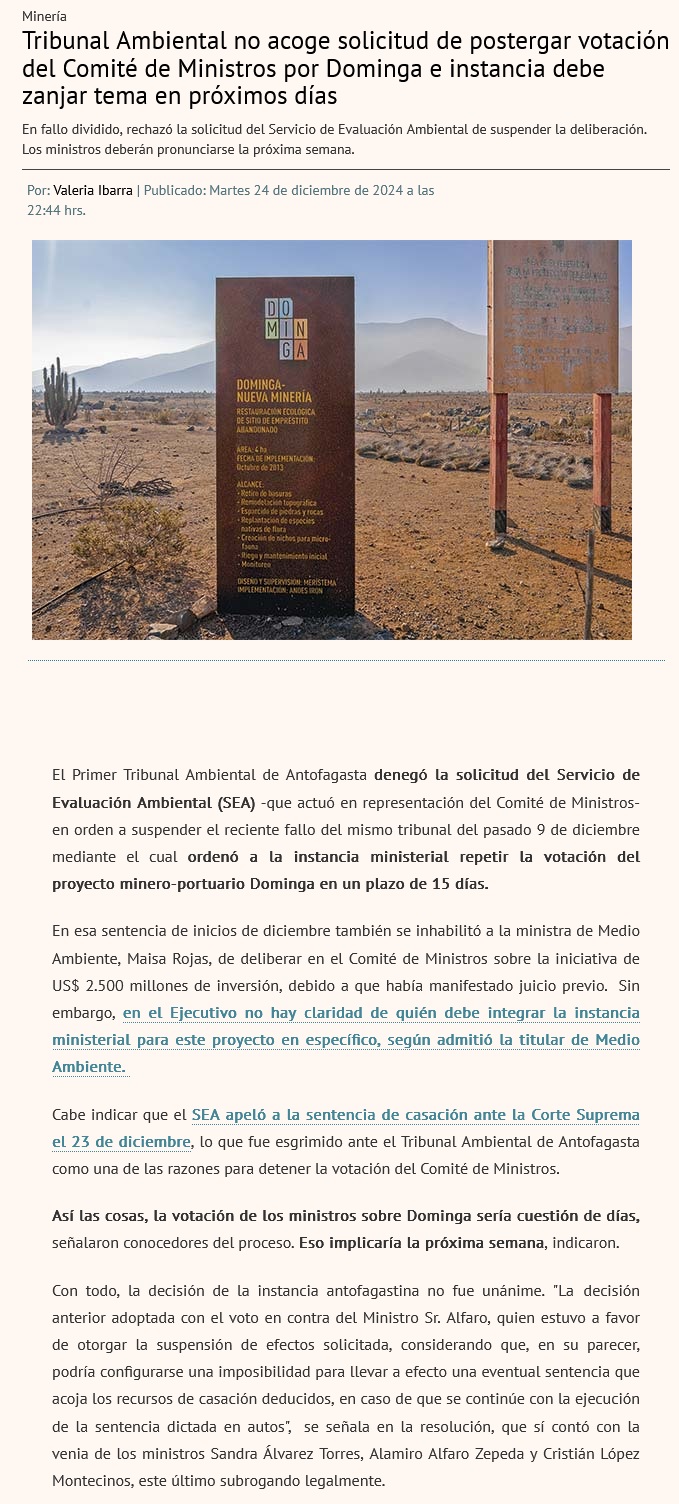 Sube tensión en torno a Dominga: Tribunal Ambiental niega suspensión y obliga al Comité de Ministros a pronunciarse en días - (El Mercurio de Santiago)