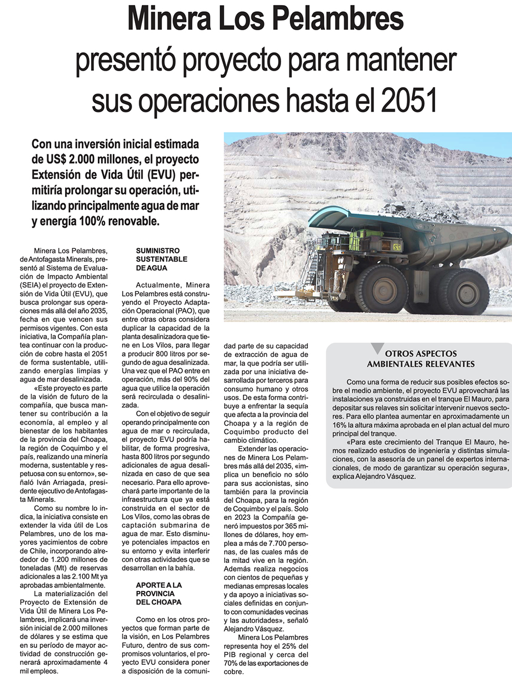 Los Pelambres ingresa al SEIA proyecto por US$ 2.000 millones - (El Mercurio de Santiago)
