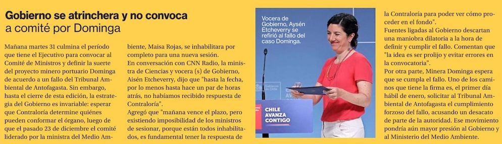 Dominga: Gobierno esperará a Contraloría para conformar Comité de Ministros y votar proyecto - (Diario Financiero)