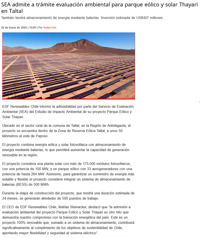 SEA admite a trámite evaluación de parque eólico y solar Thayari en Taltal - (El Mercurio de Antofagasta)