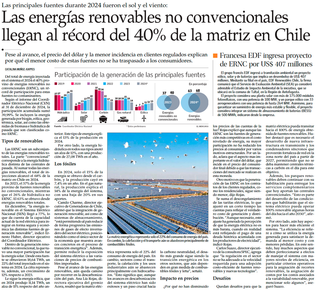 Energías renovables representaron del orden de 68% de la generación en 2024 - (Diario Financiero)