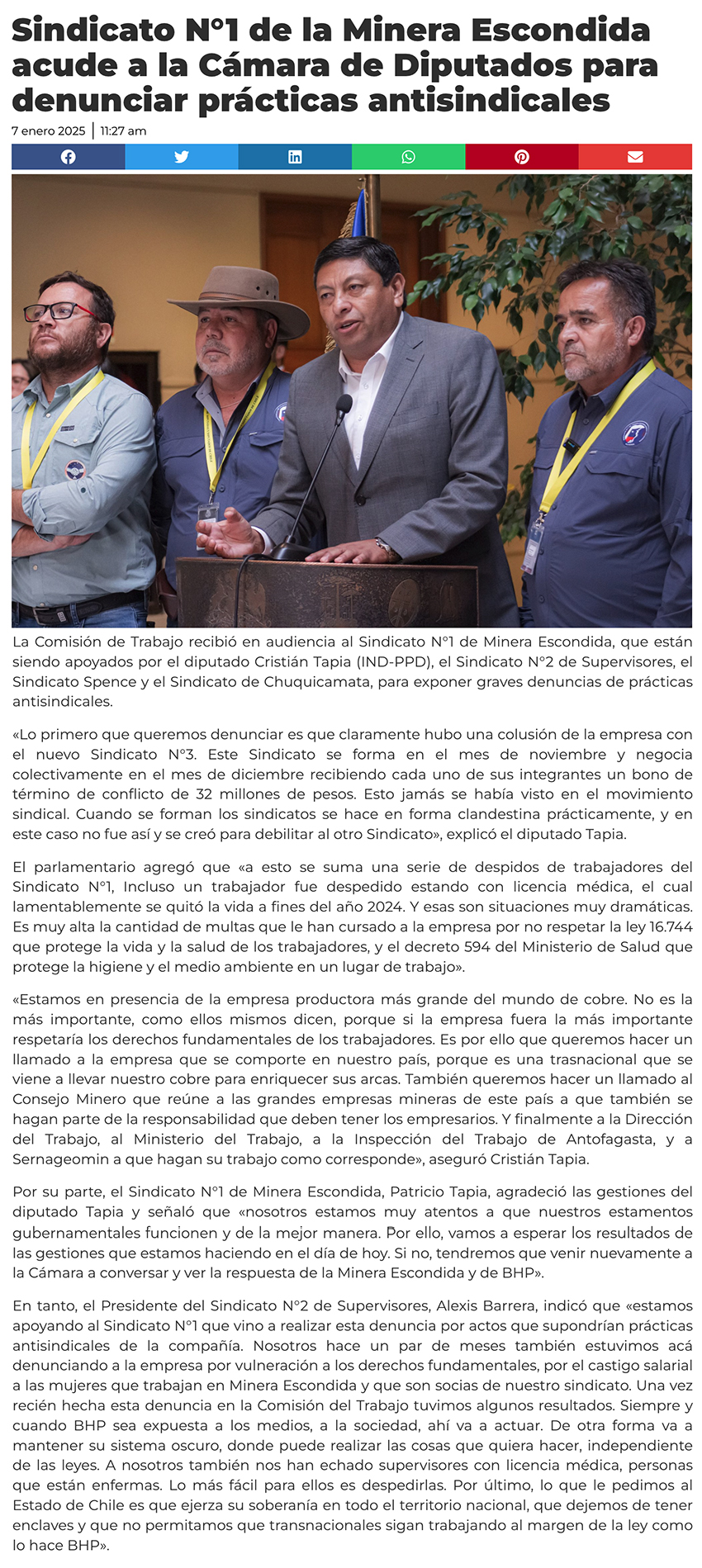 Sindicato N°1 de Minera Escondida denuncia vulneraciones laborales ante la Comisión de Trabajo - (madero.cl)