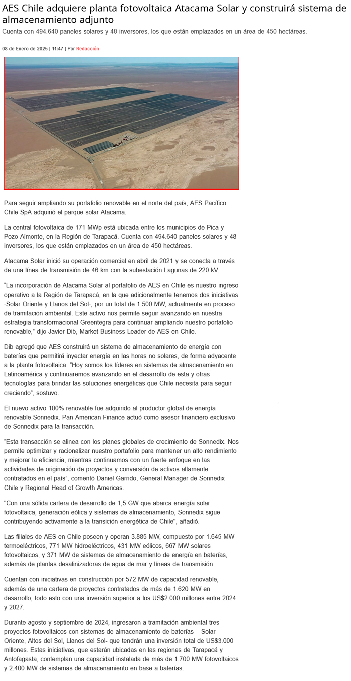AES Chile adquiere planta fotovoltaica de Sonnedix en la Región de Tarapacá - (Diario Financiero)