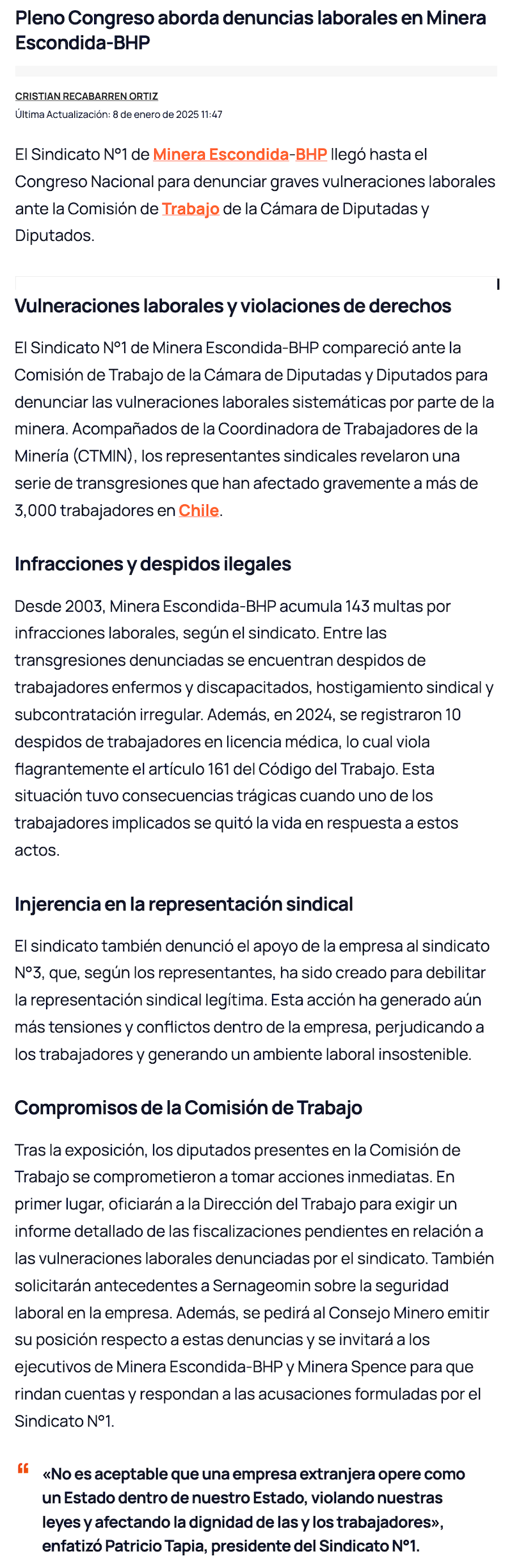 Sindicato N°1 de Minera Escondida expone vulneraciones laborales ante diputados - (reporteminero)