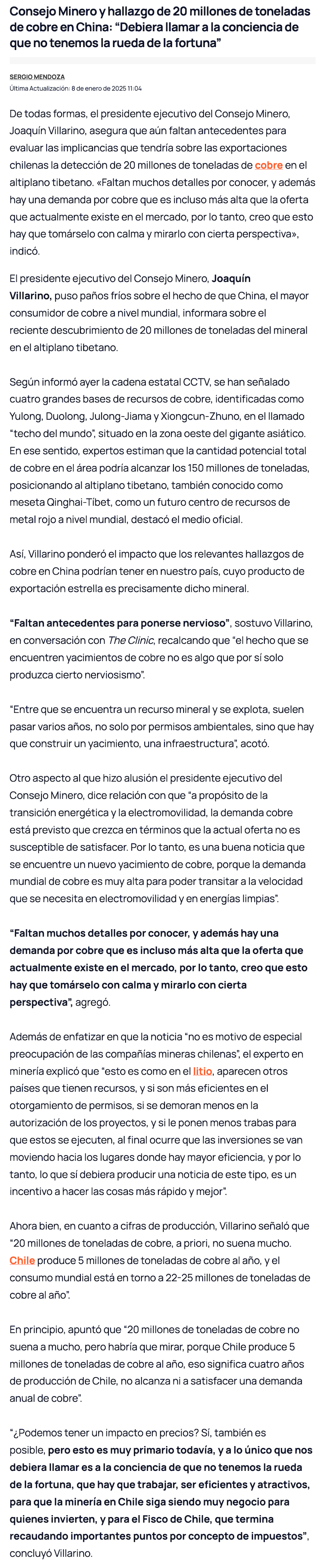 Consejo Minero y hallazgo de gran yacimiento de cobre en China: “Faltan antecedentes para ponerse nervioso” - (soyantofagasta)
