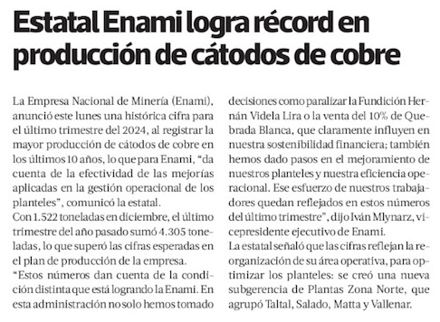 Récord en la Empresa Nacional de Minería: Cuarto trimestre de 2024 fue el mejor en producción de cátodos en últimos diez años - (diarioantofagasta)
