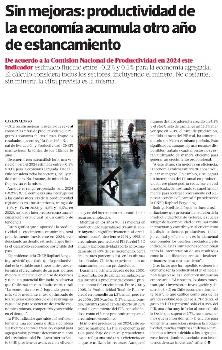 Sigue el estancamiento de la productividad en Chile: registra nulo avance en 2024 y lastra al PIB - (Diario Financiero)