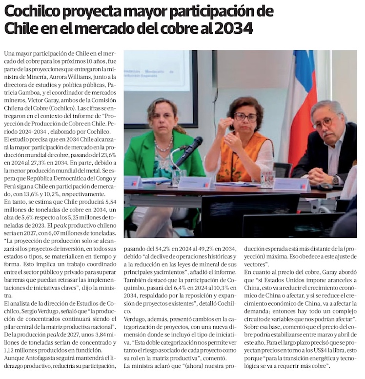Cobre chileno como líder indiscutido: alcanzará el 27,3% de la producción mundial en 2034 - (Diario Financiero)