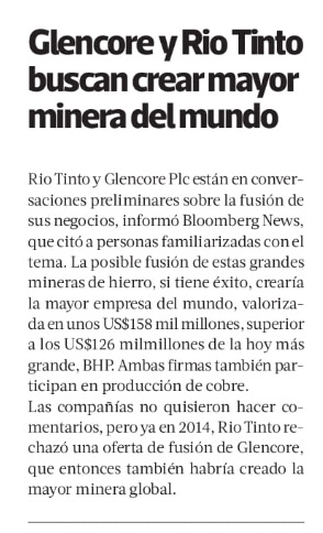 Rio Tinto y Glencore discuten posible fusión que crearía un nuevo líder global en la industria minera - (Diario Financiero)