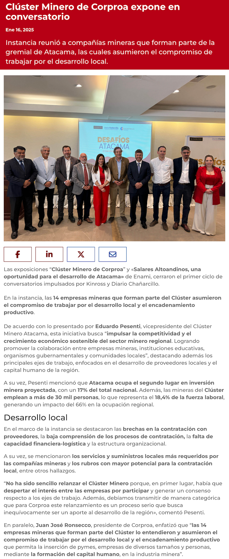 Kinross y Diario Chañarcillo realizaron exitoso y concurrido sexto conversatorio "Desafíos de Atacama" con el Clúster Minero de Corproa como tema central - (El Chañarcillo)