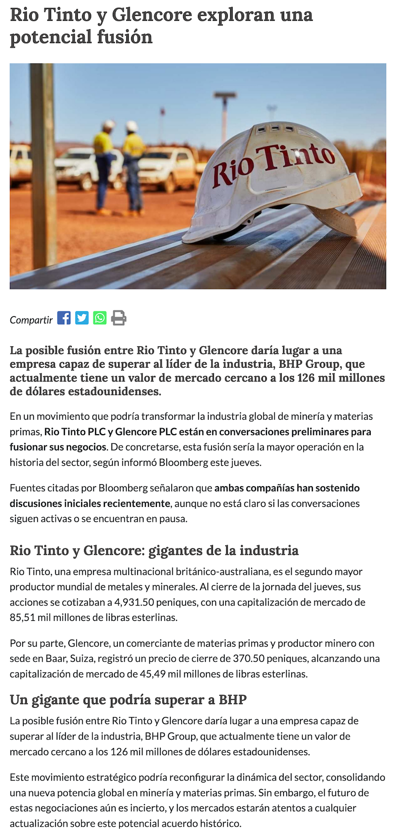 Rio Tinto y Glencore discuten posible fusión que crearía un nuevo líder global en la industria minera - (Diario Financiero)