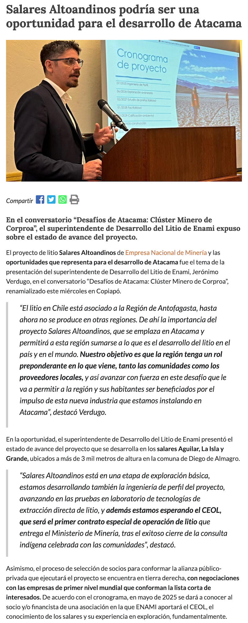 Enami presenta proyecto de litio Salares Altoandinos como una oportunidad para el desarrollo de Atacama - (El Chañarcillo)