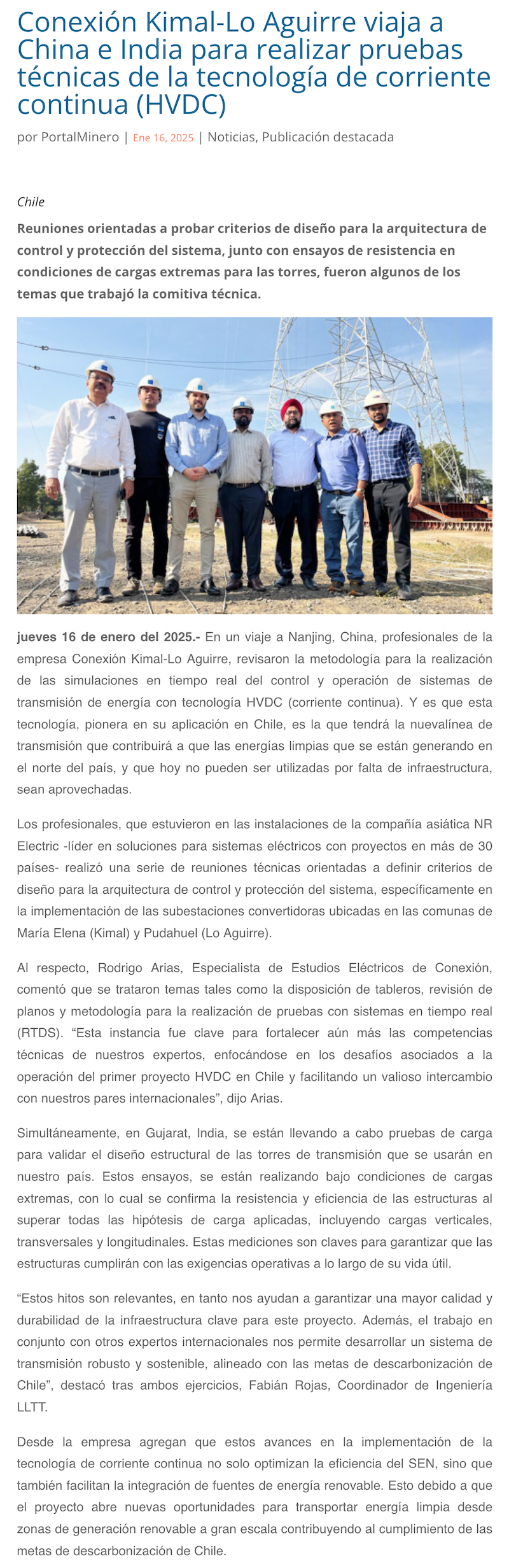 Kimal-Lo Aguirre hace pruebas a la corriente continua en China - (El Mercurio de Calama)