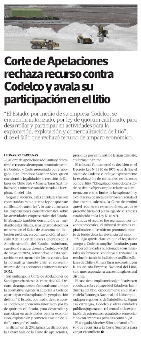 Corte de Apelaciones rechaza recurso contra Codelco y avala su participación en la explotación del litio - (La Tercera Online)
