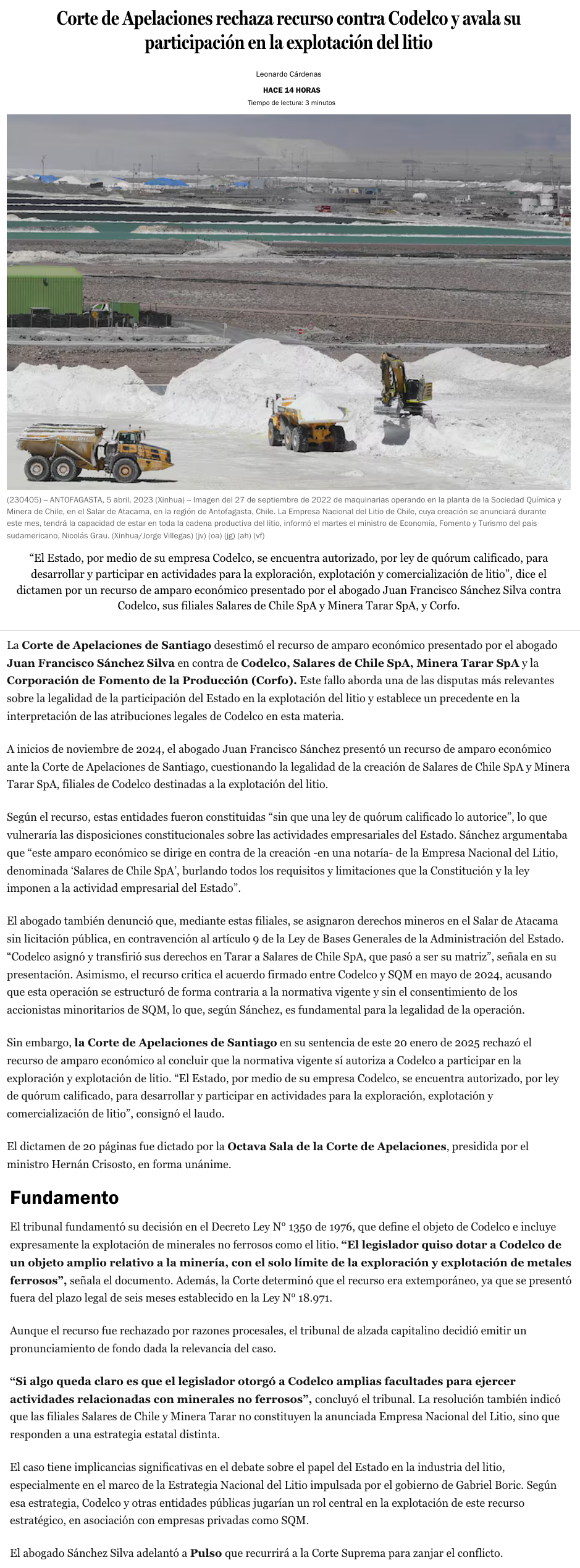 Corte de Apelaciones rechaza recurso contra Codelco y avala su participación en el litio - (Pulso)