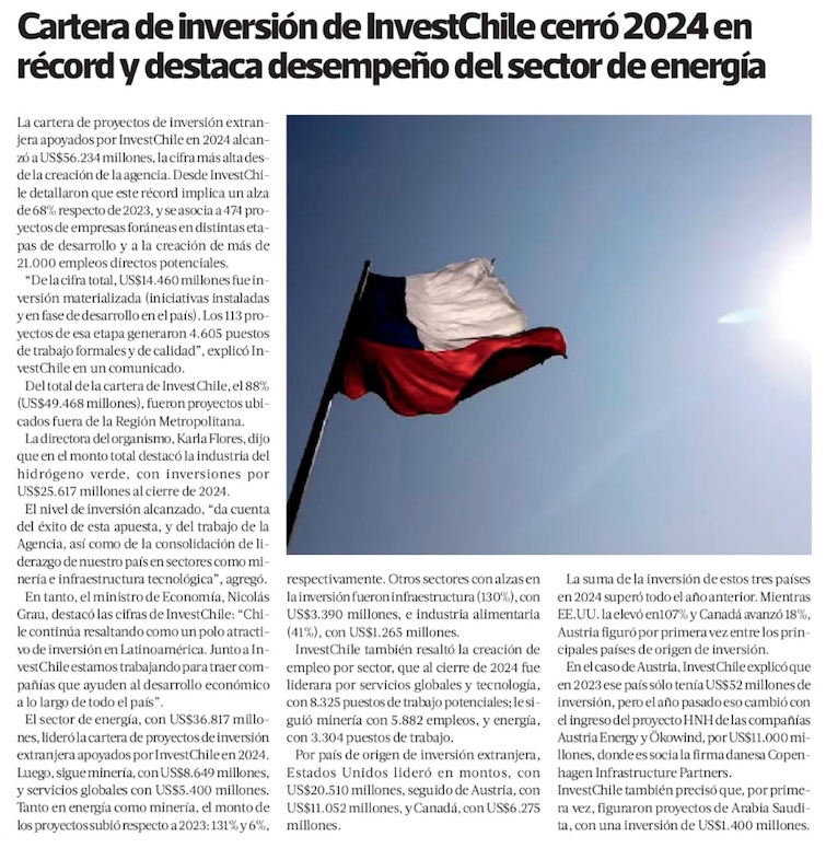 Chile finaliza 2024 con alza de 68% en su cartera de proyectos de inversión extranjera: empresas de EEUU duplicaron monto - (DF Online)