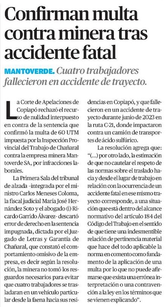 Corte de Copiapó multa a empresa minera por fallecimiento de trabajadores en accidente de trayecto - (mch.cl)