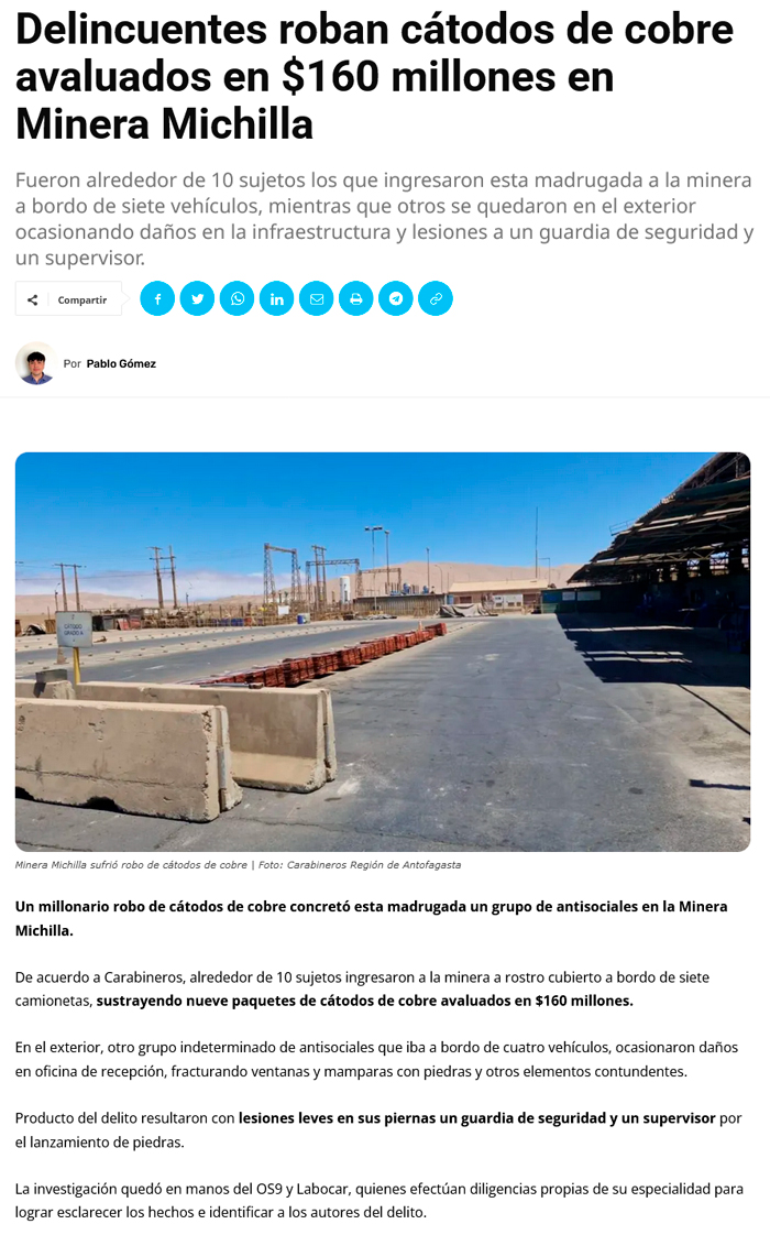 Nuevo robo con violencia en Minera Michilla: Cátodos sustraídos son avaluados en $160 millones - (El Mercurio de Antofagasta)