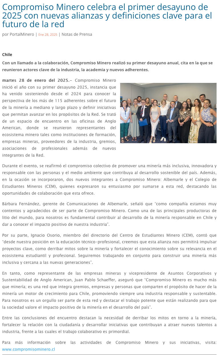 Compromiso Minero celebra su primer desayuno de 2025 con nuevas alianzas y definiciones clave para el futuro de la red - (mch.cl)
