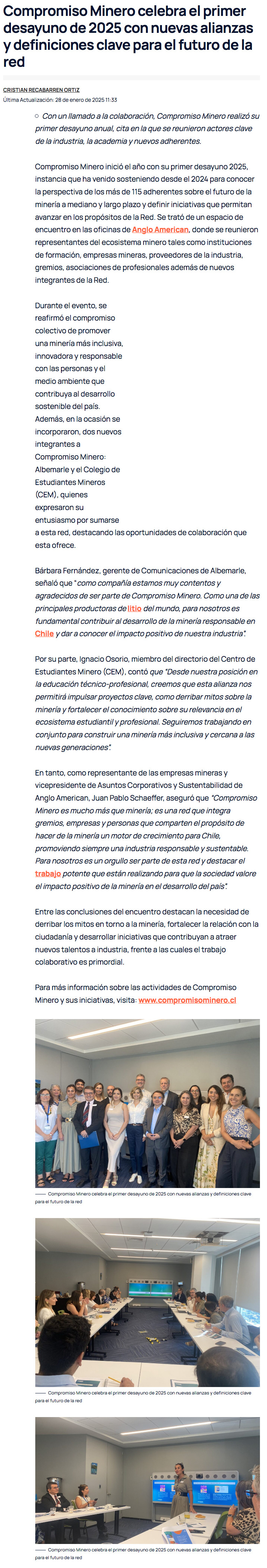 Compromiso Minero celebra su primer desayuno de 2025 con nuevas alianzas y definiciones clave para el futuro de la red - (mch.cl)