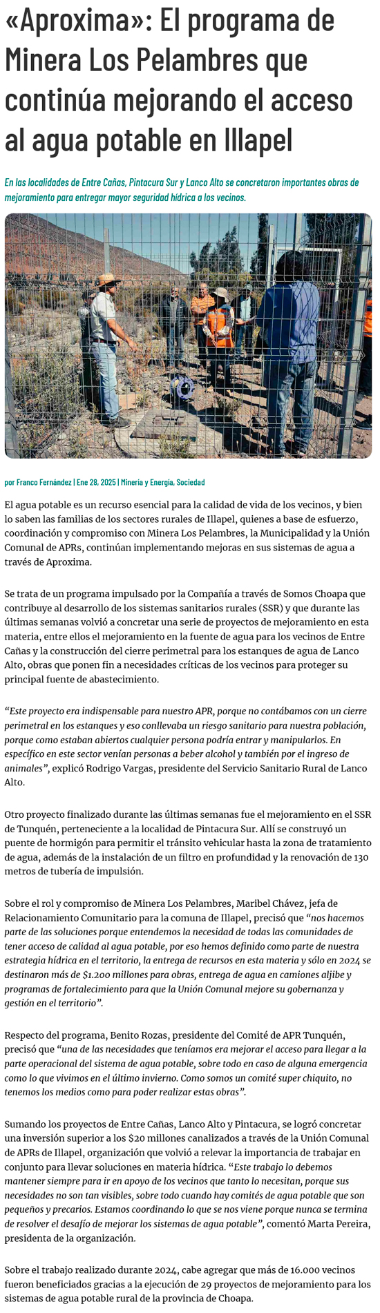 APROXIMA: El programa de Minera Los Pelambre que continúa mejorando el acceso al agua potable en Illapel - (La Región)