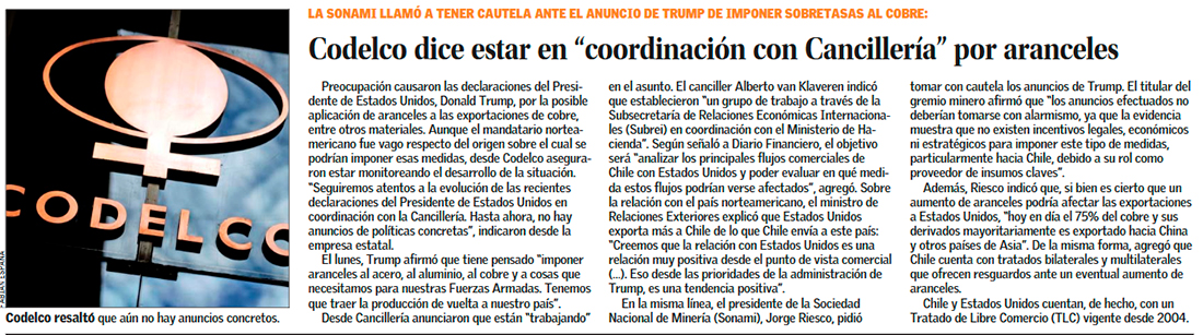 Codelco tras amenaza de Trump de aranceles al cobre: "Seguiremos atentos la evolución de las declaraciones del Presidente de EEUU" - (DF Online)