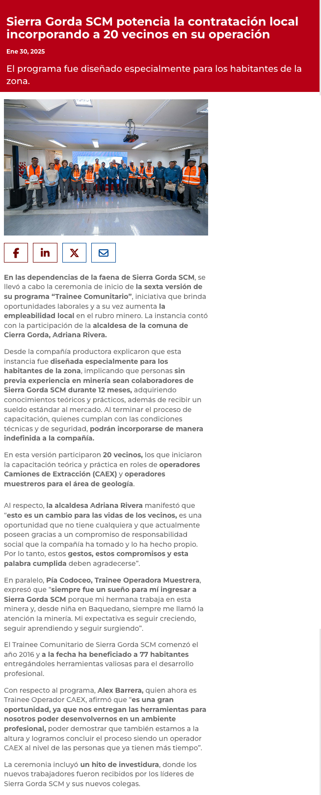 Sierra Gorda SCM aumenta la contratación local insertando a 20 vecinos en su operación - (region2)