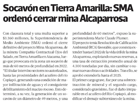 SMA decreta clausura de mina Alcaparrosa por socavón de 2022 - (El Mercurio de Santiago)