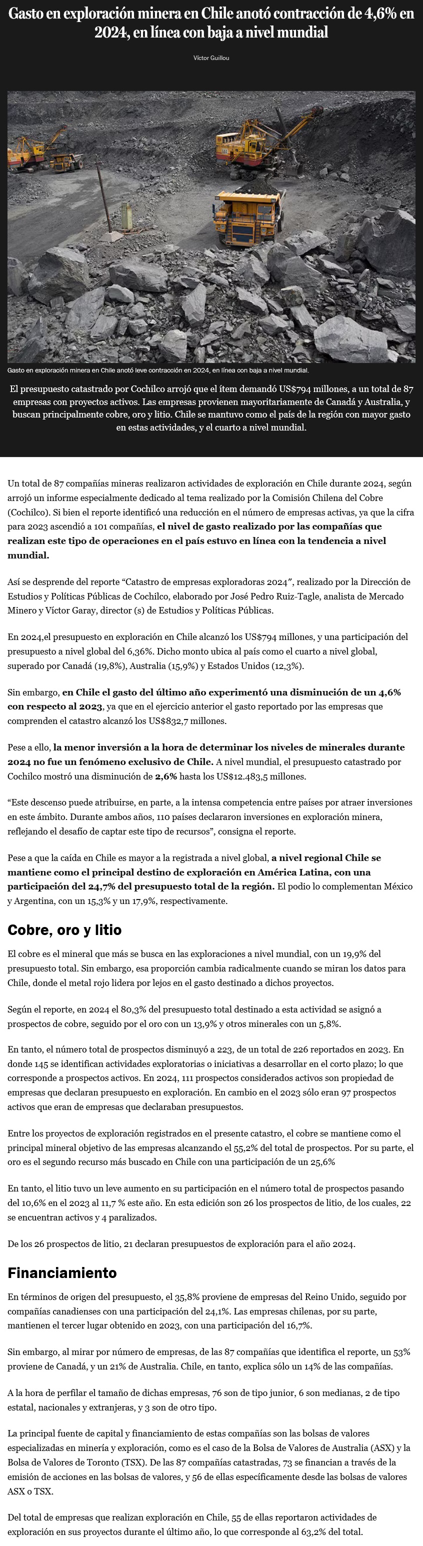 Gasto en exploración minera en Chile anota contracción de 4,6% en 2024, en línea con baja a nivel mundial - (Pulso)