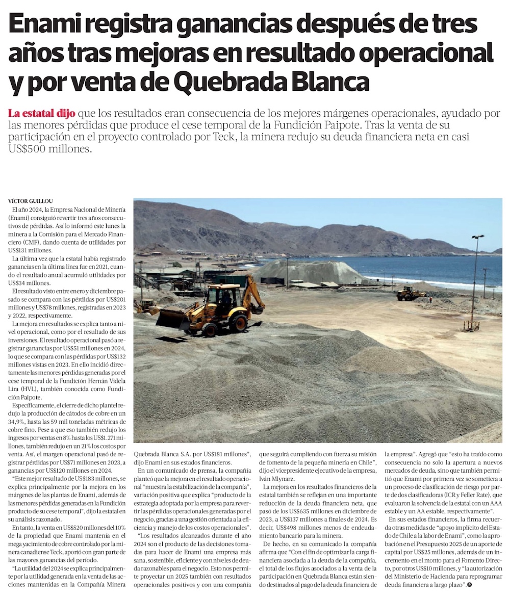 Enami sale de la zona roja y vuelve a tener ganancias en 2024: US$ 131 millones de utilidades - (Diario Financiero)
