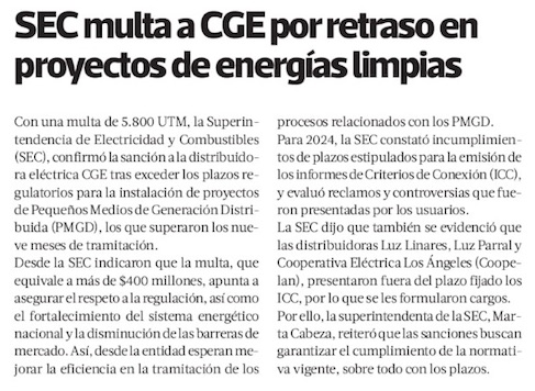 SEC multa a CGE con $400 millones por exceder plazos para instalación de PMGD - (El Mercurio de Santiago)