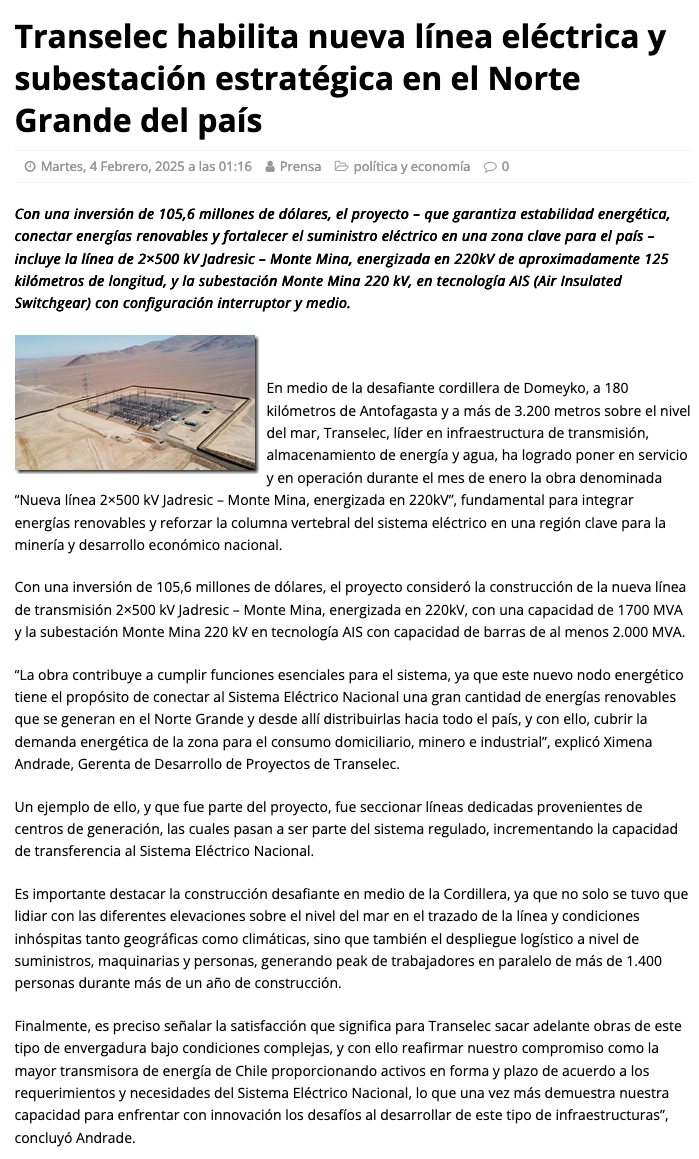Transelec habilita nueva línea eléctrica y subestación estratégica en el Norte Grande del país - (portalminero)