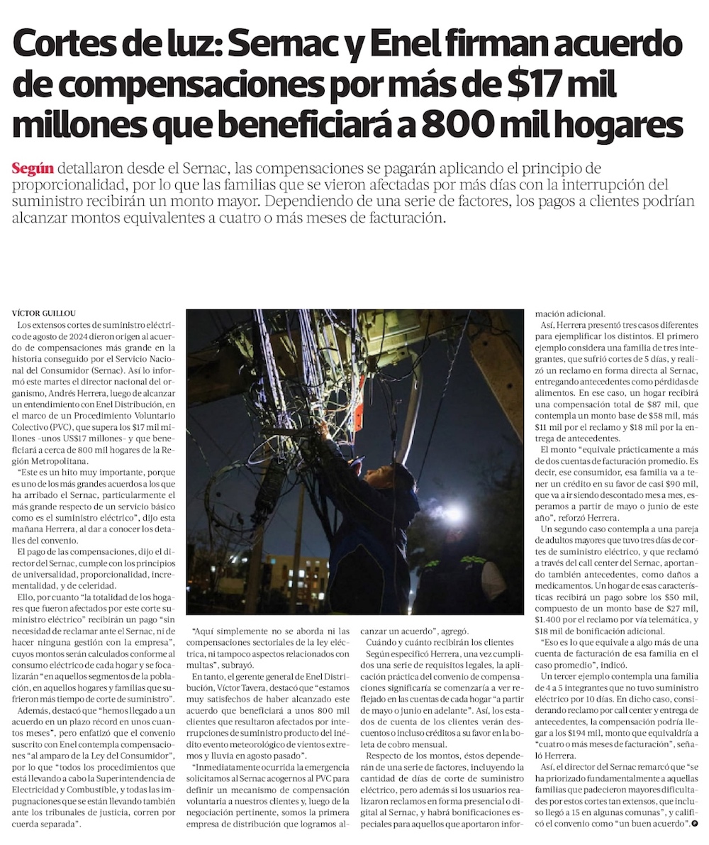 Cortes de luz: Sernac y Enel acuerdan compensaciones por más de $17 mil millones para 800 mil hogares - (Diario Financiero)