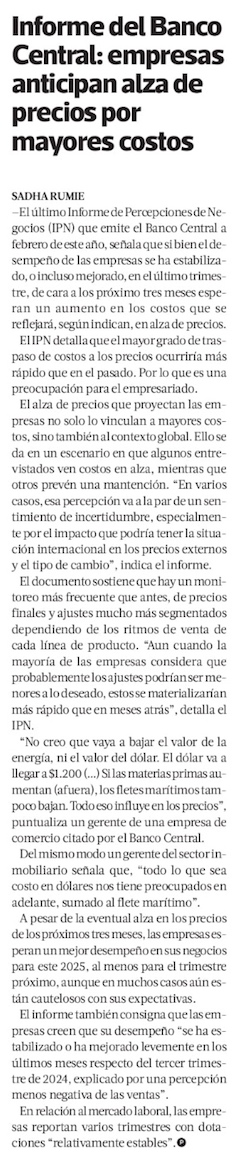 Las empresas reportan mejor desempeño al partir el año, pero les preocupa el alza de costos hacia adelante - (Diario Financiero)